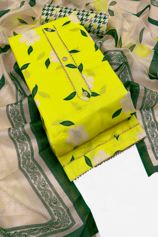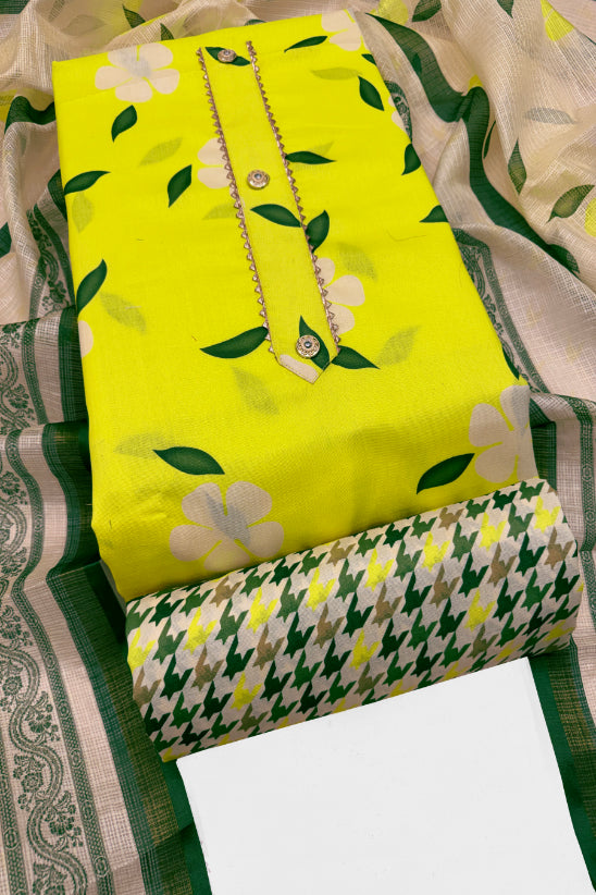Cotton Blend Printed Suit Set with Kota Doria Dupatta for Women’s Unstitched (Top 2.5m | Bottom 2.5m | Dupatta 2.25m)